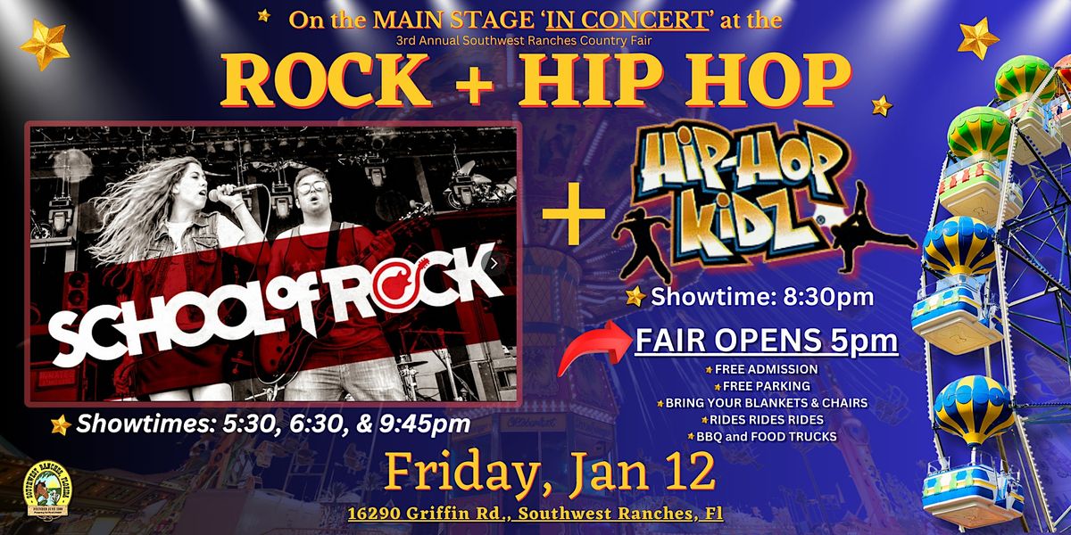 Free Live Concert at the Fair, 16290 Griffin Rd, Southwest Ranches, Networking event in southwest ranches, fl by aster knight parks foundation on thursday, january 11 2025 with 1.5k people interested and 64 people going. Parents and kids can enjoy a country fair with rides, food trucks, carnival food, and games for the whole family.